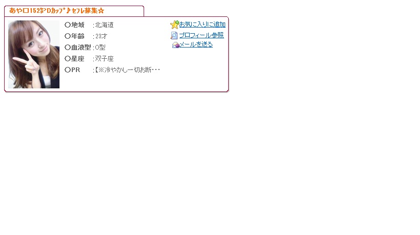 メール交換して2回程アポを取ったが、来なかった。地元にはない喫茶店名の所に居るとか理由つけて、話も噛み合わない。怪しいから地元の人なら誰でも知っている質問をしたら、答えずに挙句の果てには、此方を馬鹿扱い。たぶんサクラですね。